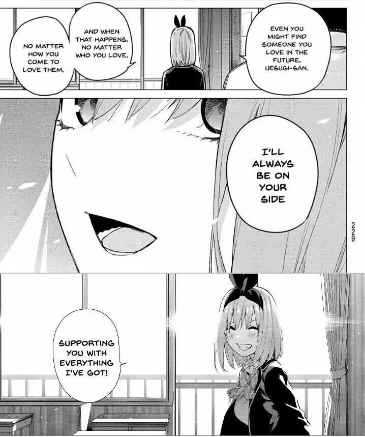 She's Fuutarou's support from the beginning of the manga, helping him getting along with her sisters, cheering him up when he's in a slump, and she's the one who gave up her love for the sake of protecting the bonds she has with her sisters...although that's a problem in recent chapters